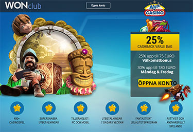 25% cashback, varje dag. 30% bonus upp till 1800 kr på måndagar och fredagar- | Extremt trevligt spelutbud med live betting, live casino, slottar och 3D casino. Ger 25% cashback var eviga dag. | Won Club recension |